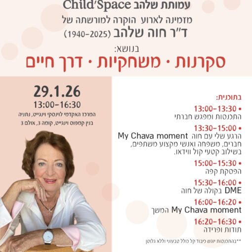 אירוע הוקרה למורשתה של ד"ר חוה שלהב – 29.01.26 לחברי/ות קהילת שלהב Child’Space, מצורפת הזמנה לאירוע הוקרה למורשתה של ד"ר חוה שלהב (1940-2025). האירוע יתקיים בקמפוס וינגייט נתניה, ובמקביל באופן מקוון בזום. […]